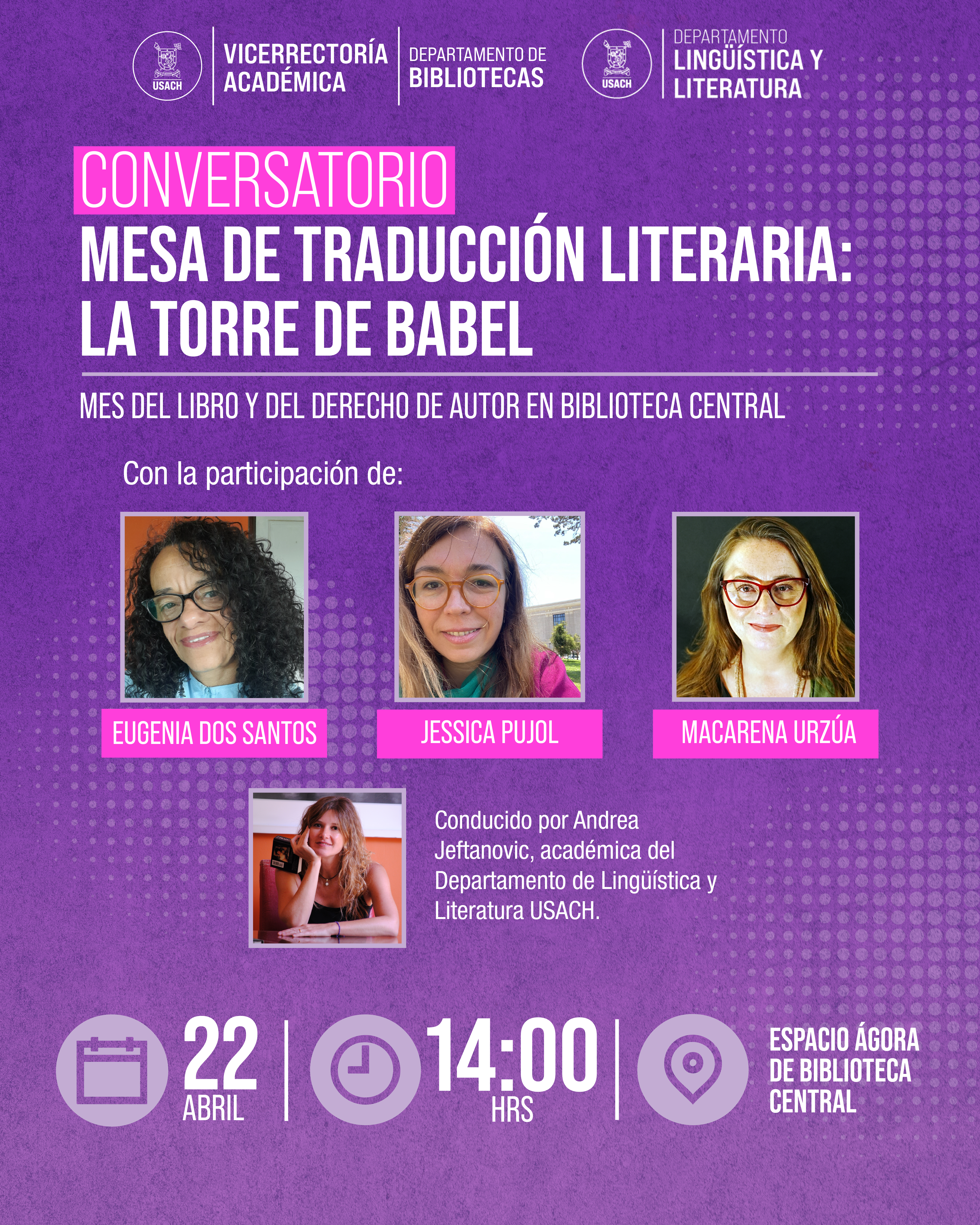 El encuentro se realizará el miércoles 21 de abril, entre las 14:00 y 15:10 horas, en el Espacio Ágora de la Biblioteca Central. La actividad reunirá a destacadas académicas y traductoras del Departamento de Lingüística y Literatura, quienes abordarán los desafíos, cruces culturales y procesos creativos que implica trasladar una obra literaria entre lenguas.