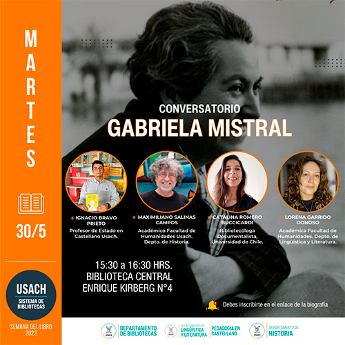 Conversatorio: A 134 años del nacimiento de Gabriela Mistral. Entre las 15:30 y 16:30 estaremos realizando este conversatorio, el cual contará con la presencia de Ignacio Bravo Prieto, profesor de Estado en Castellano Usach, Maximiliano Salinas Campos, académico Facultad de Humanidades Usach, Departamento de Historia, Catalina Romero Buccicardi, bibliotecóloga Documentalista y Lorena Garrido Donoso, académica de la Facultad de Humanidades, Departamento de Lingüística y Literatura. * La entrada es liberada, pero debes inscribirte previamente haciendo clic en este enlace.
