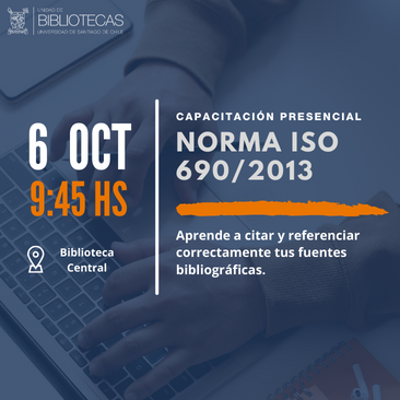 Te invitamos a participar en el Taller: Aplicando correctamente la norma ISO 690 2013, se realizará el día 6 de octubre a las 9:45 AM en Biblioteca Central.