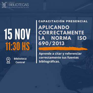Te invitamos a participar en el Taller: Aplicando correctamente la norma ISO 690 2013, se realizará el día 15 de noviembre a las 11:30 AM en Biblioteca Central.